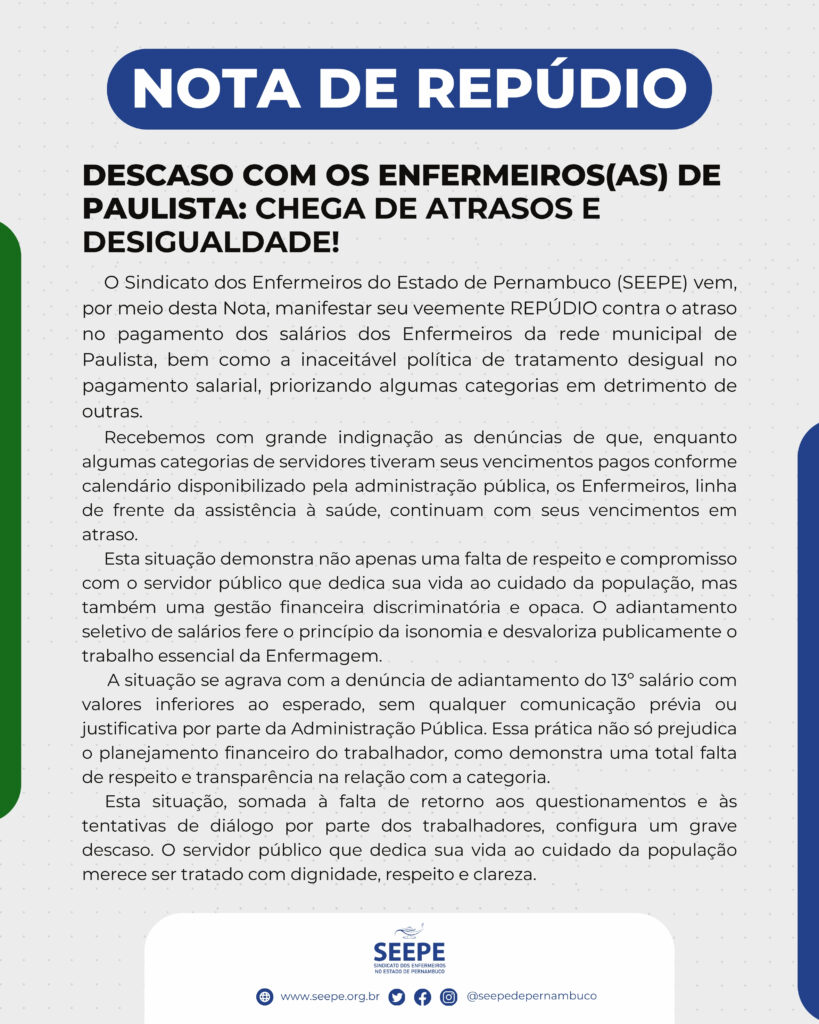 NOTA DE REPÚDIO – DESCASO COM OS ENFERMEIROS(AS) DE PAULISTA: CHEGA DE ATRASOS E DESIGUALDADE! Sindicato dos Enfermeiros do Estado de Pernambuco (SEEPE) Ao Excelentíssimo Senhor Prefeito do Paulista e à Secretaria Municipal de Saúde, O Sindicato dos Enfermeiros do Estado de Pernambuco (SEEPE) vem, por meio desta Nota, manifestar seu veemente REPÚDIO contra o atraso no pagamento dos salários dos Enfermeiros da rede municipal de Paulista, bem como a inaceitável política de tratamento desigual no pagamento salarial, priorizando algumas categorias em detrimento de outras. Recebemos com grande indignação as denúncias de que, enquanto algumas categorias de servidores tiveram seus vencimentos pagos conforme calendário disponibilizado pela administração pública, os Enfermeiros, linha de frente da assistência à saúde, continuam com seus vencimentos em atraso.Esta situação demonstra não apenas uma falta de respeito e compromisso com o servidor público que dedica sua vida ao cuidado da população, mas também uma gestão financeira discriminatória e opaca. O adiantamento seletivo de salários fere o princípio da isonomia e desvaloriza publicamente o trabalho essencial da Enfermagem.A situação se agrava com a denúncia de adiantamento do 13º salário com valores inferiores ao esperado, sem qualquer comunicação prévia ou justificativa por parte da Administração Pública. Essa prática não só prejudica o planejamento financeiro do trabalhador, como demonstra uma total falta de respeito e transparência na relação com a categoria.Esta situação, somada à falta de retorno aos questionamentos e às tentativas de diálogo por parte dos trabalhadores, configura um grave descaso. O servidor público que dedica sua vida ao cuidado da população merece ser tratado com dignidade, respeito e clareza. O SEEPE EXIGE: 1. Imediata Regularização: O pagamento integral dos salários em atraso e a complementação dos valores do 13º salário dos Enfermeiros da rede municipal de Paulista devem ser efetuados de forma imediata.2. Isonomia e Transparência: O fim da política de priorização salarial que penaliza a Enfermagem e a apresentação de um calendário de pagamentos claro e definitivo.3. Diálogo Efetivo: Retorno imediato aos questionamentos dos trabalhadores e abertura de um canal de diálogo eficaz com a representação sindical para resolver esta e futuras pendências. Alertamos que a persistência desta situação de atraso, desigualdade salarial e falta de comunicação poderá levar à adoção de medidas sindicais mais enérgicas, incluindo mobilização e paralisação dos serviços, a fim de defender a dignidade e os direitos dos trabalhadores. O SEEPE reafirma seu compromisso inabalável com a categoria e responsabiliza a gestão municipal do Paulista por qualquer prejuízo ou interrupção nos serviços de saúde decorrentes deste descaso. Recife, 6 de Outubro de 2025.