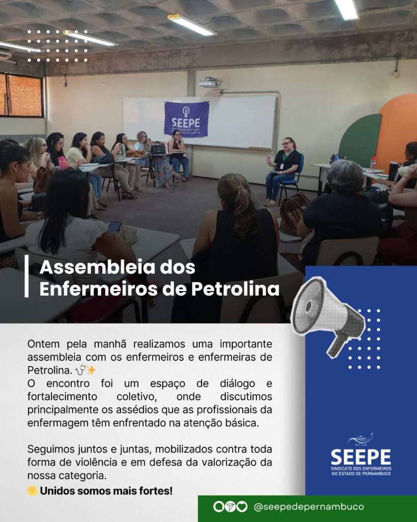 Assembleia dos Enfermeiros e Enfermeiras do municipio de Petrolina  No dia 22 de setembro aconteceu uma importante assembleia com os enfermeiros e enfermeiras de Petrolina.O encontro foi um espaço de diálogo e fortalecimento coletivo, onde discutimos principalmente os assédios que as profissionais da enfermagem têm enfrentado na atenção básica. Seguimos juntos e juntas, mobilizados contra toda forma de violência e em defesa da valorização da nossa categoria.